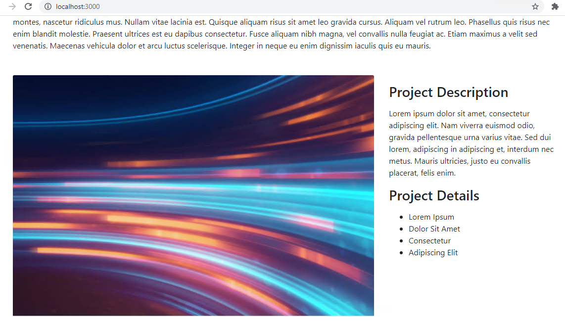 <div class="row pb-5"> <div class="col-md-8"><img src="https://sc93.sc/-/media/project/uniform-mvc-kit/waves.ashx?h=480&iar=0&w=720&hash=15DB7893AEEA90AE6394DD0F9B21F985" class="card-img-top img-fluid" alt="waves" width="720" height="480"></div> <div class="col-md-4"> <h3 class="my-3">Project Description</h3> <p>Lorem ipsum dolor sit amet, consectetur adipiscing elit. Nam viverra euismod odio, gravida pellentesque urna varius vitae. Sed dui lorem, adipiscing in adipiscing et, interdum nec metus. Mauris ultricies, justo eu convallis placerat, felis enim.</p> <h3 class="my-3">Project Details</h3> <ul> <li>Lorem Ipsum</li> <li>Dolor Sit Amet</li> <li>Consectetur</li> <li>Adipiscing Elit</li> </ul> </div></div>Step 2. Create a simple component in Uniform Next.js App#